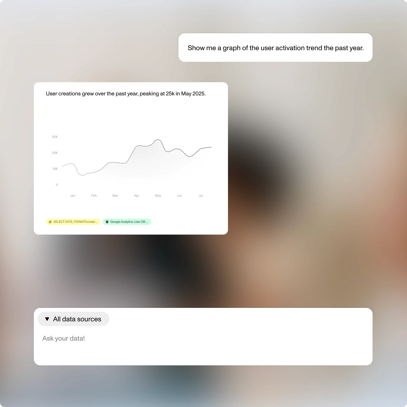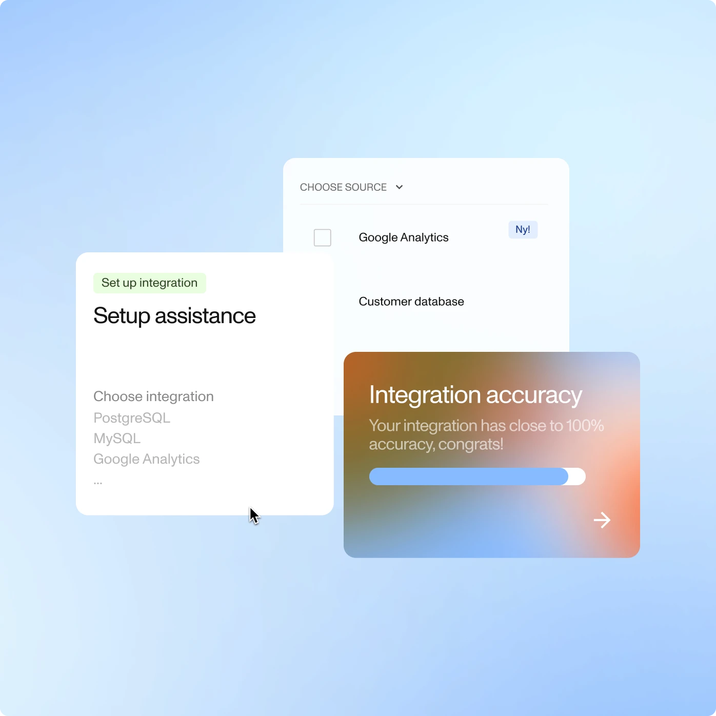 Connect all your data sources into one view - with simple onboarding of databases, Google Analytics and more. No siloed data. Just clarity from the start.